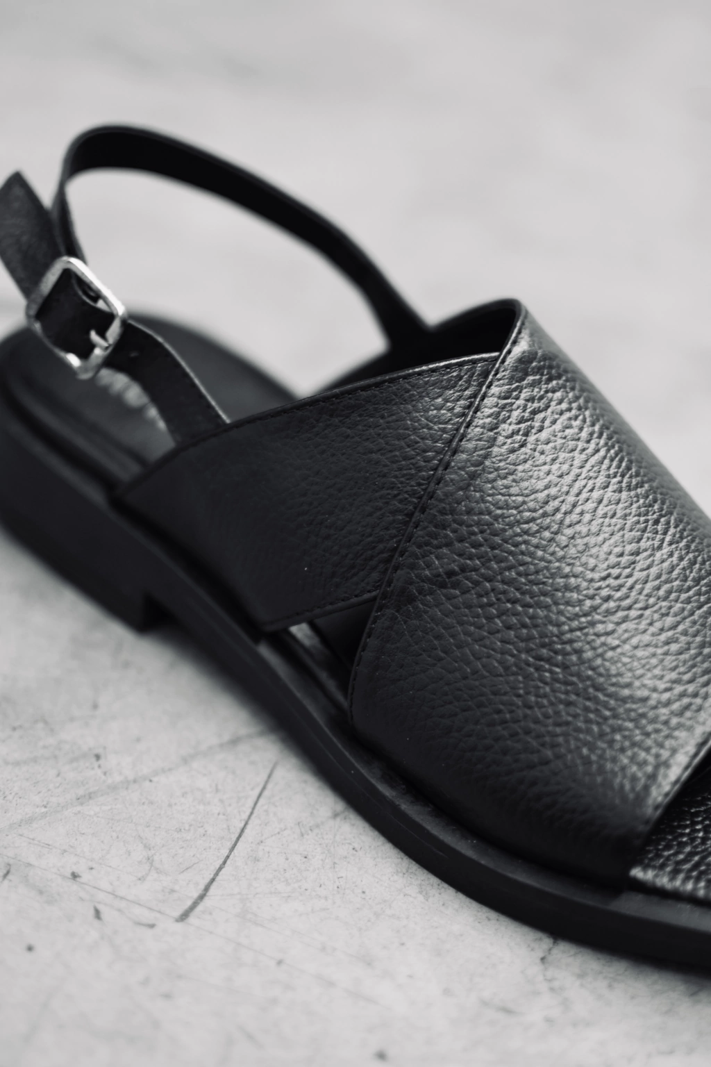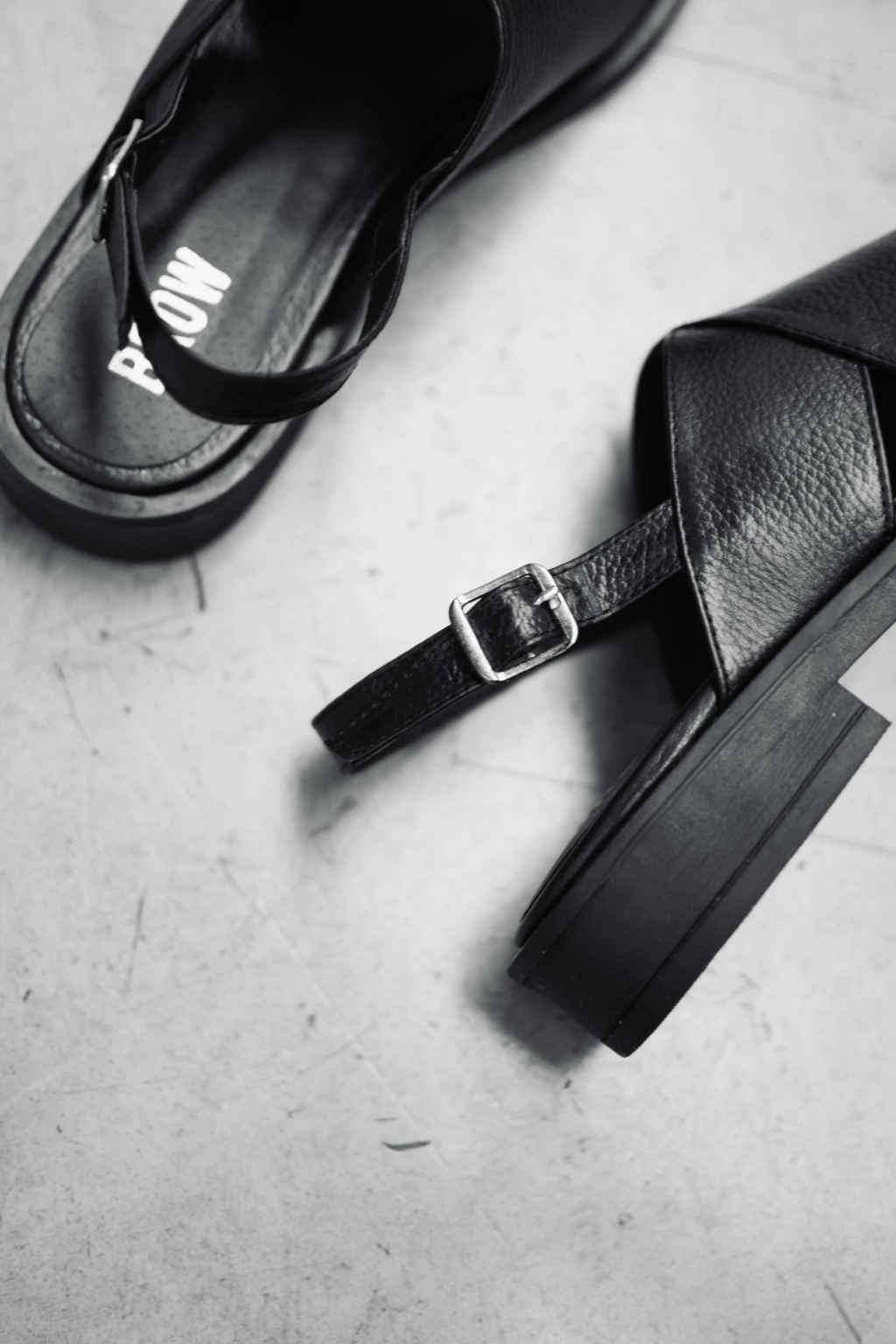 Detalle del producto:Sandalia baja de cuero, con tiras tipo faja y regulable en la parte de atras